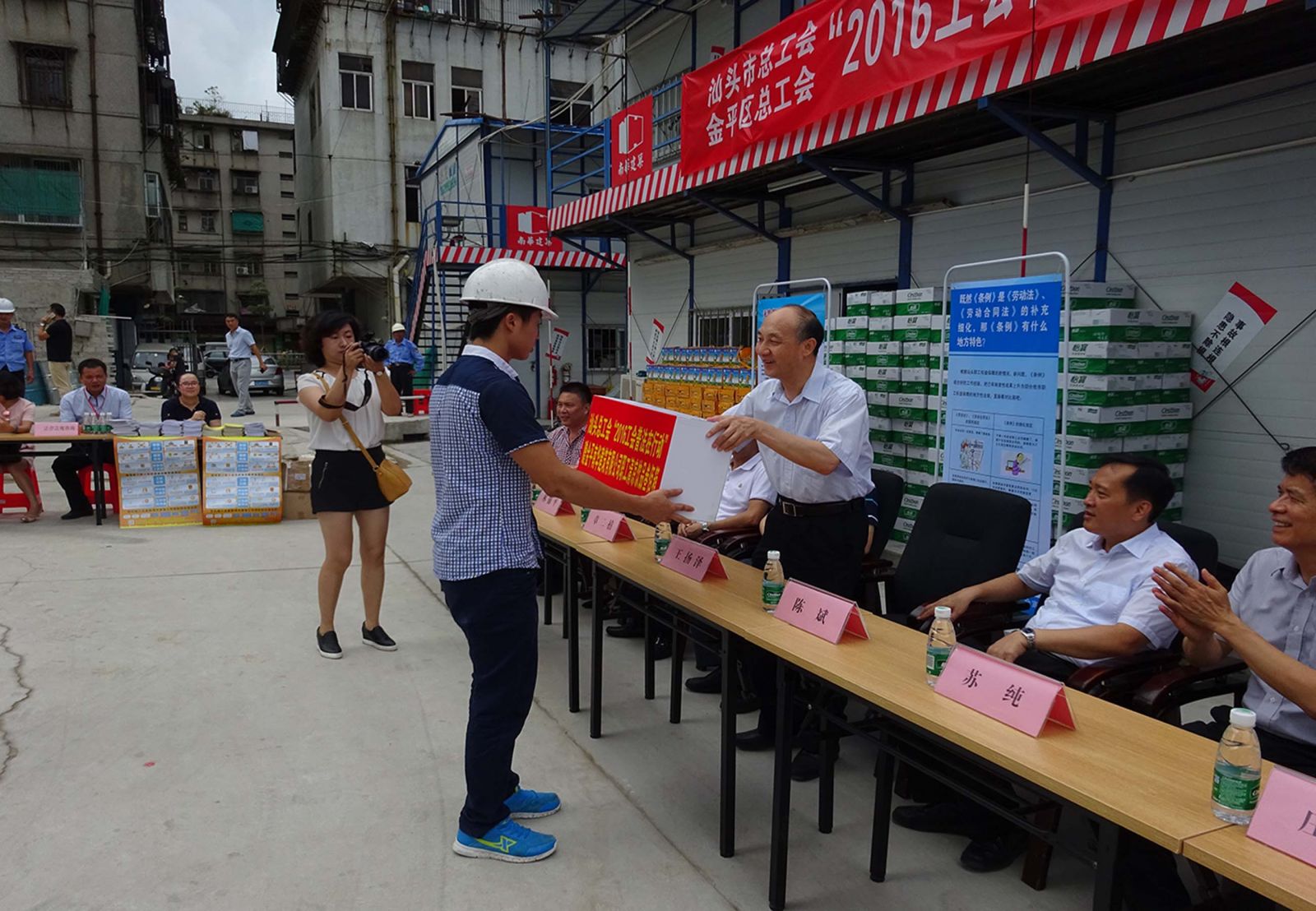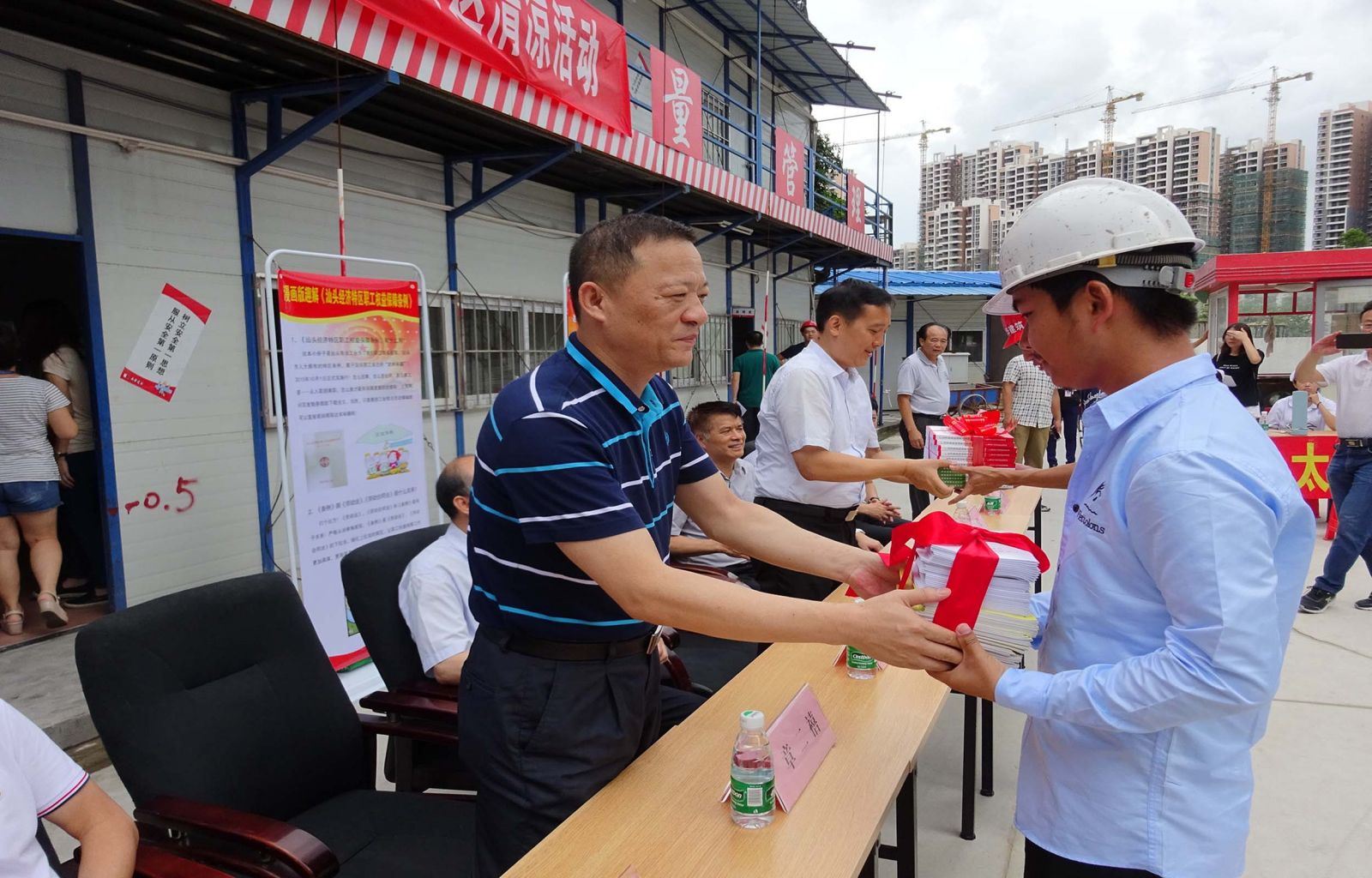 汕头市人大常委委会副主任、汕头市总工会主席王扬泽同志,汕头市总工会党组成员、副调研员章二禧同志,金平区人大常委副主任、金平区委副书记陈斌同志、区总工会主席苏纯同志、汕头市总工会法律工作部部长王晓南同志等领导以及公司董事长林锦平来到建设项目施工现场,亲切关怀和了解施工人员的工作生活情况,再三叮嘱他们在夏季高温时段工作时一定要注意作业安全,预防中暑,并将清凉饮料以及法律书籍送到他们手中,对他们付出的辛勤劳动表示感谢和慰问。