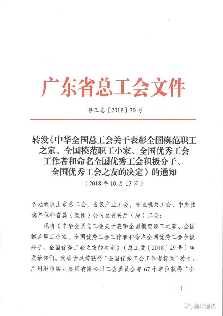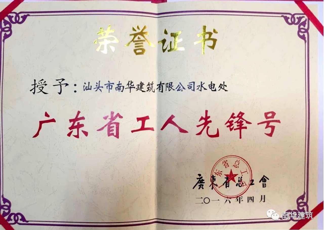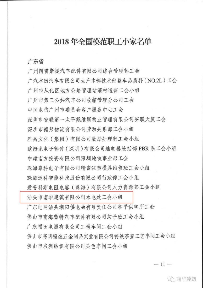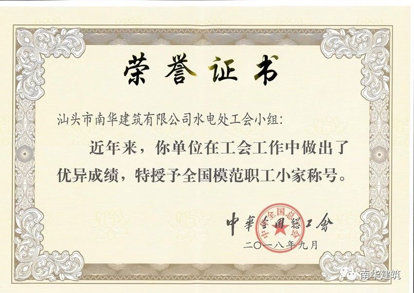 喜讯!汕头市南华建筑有限公司水电处荣获“全国模范职工小家”称号!