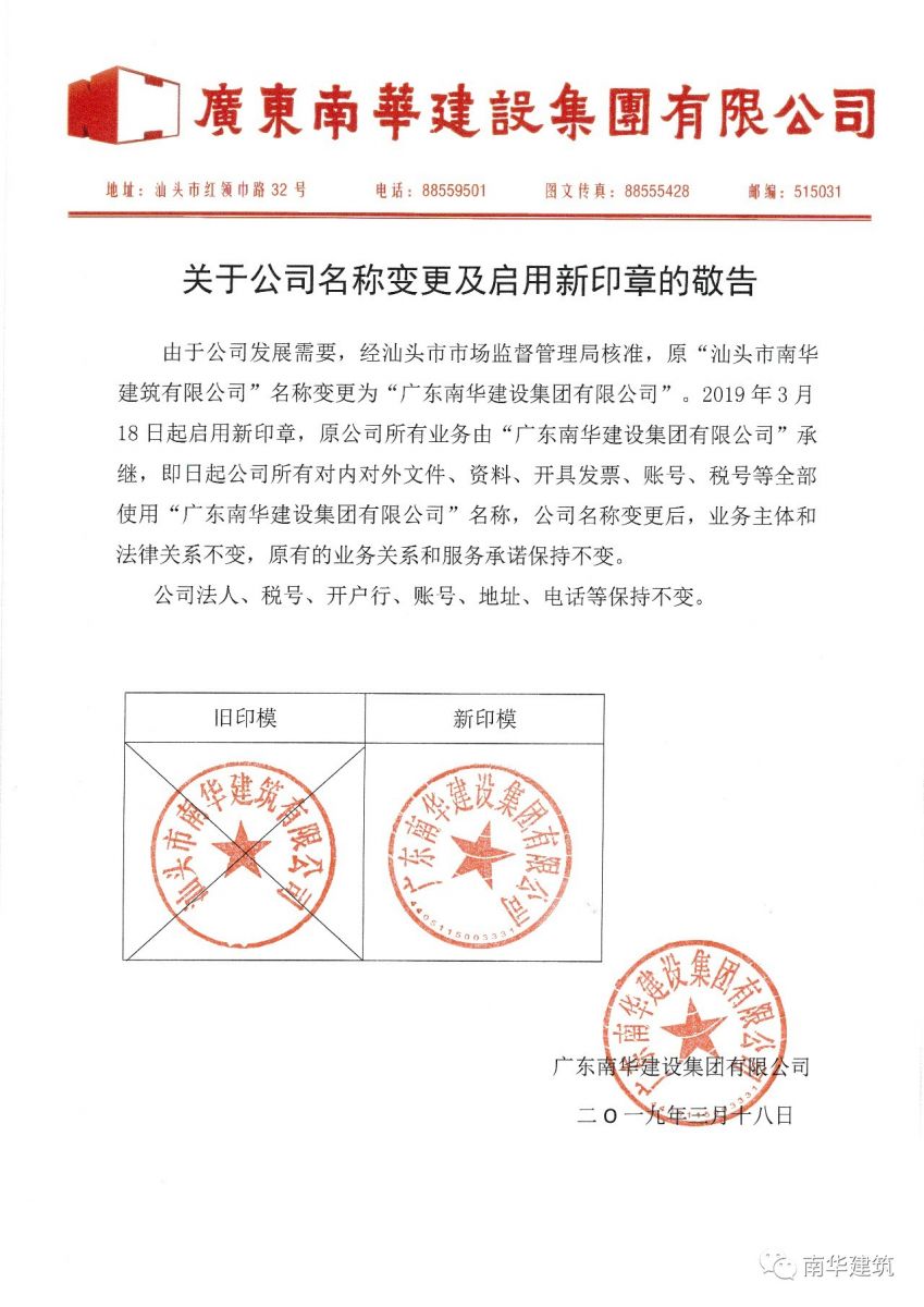 因公司名称变更给向长期关心和支持公司发展的各界人士及合作伙伴、朋友带来的不便,我们深表歉意!此次更名,标志着南华建设集团从资本、战略、规划等方面日趋成熟并步入集团化发展的新航程,对公司快速发展有重要意义。