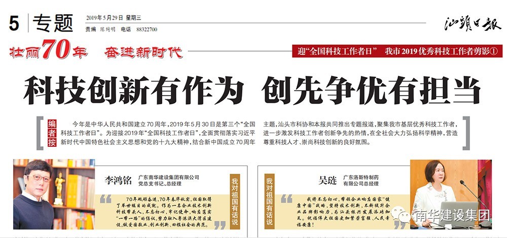 每年的5月30日是全国科技工作者的节日,在第三个国家科技工作者日到来之际,李鸿铭总经理荣获“汕头市优秀科技工作者”称号。