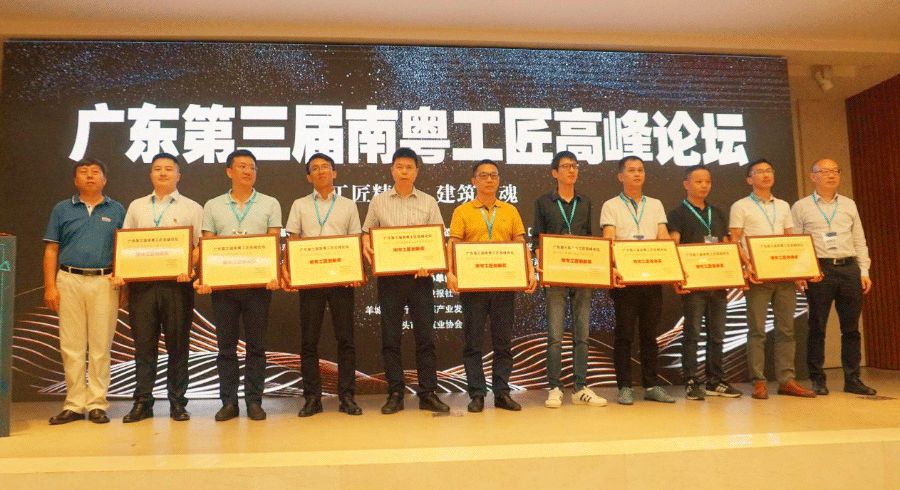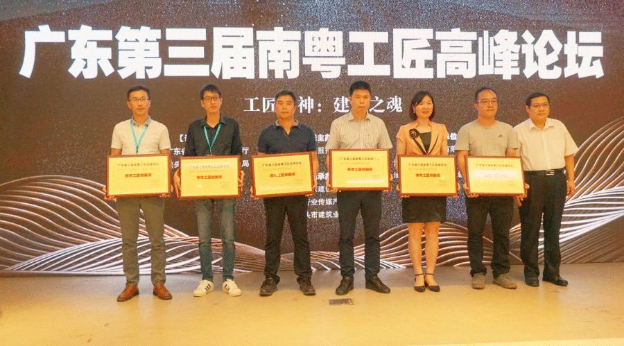 广东建设报社总编辑谢孝国和汕头建筑业协会会长林志鹏分别为汕头市潮阳建筑工程总公司、汕头市潮阳第一建安总公司、龙光工程建设有限公司、汕头市建安(集团)公司、汕头市建安实业(集团)有限公司、达濠市政建设有限公司、汕头市达濠建筑总公司、广东南华建设集团有限公司、广州大象超薄路面技术开发有限公司、广东潮泰建设有限公司颁发了“南粤工匠创新奖”。