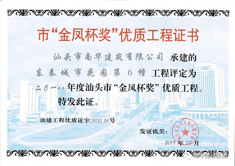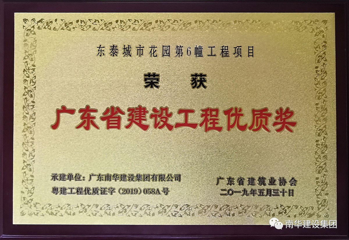 我司一直坚持“科学管理、创时代精品”的理念,不断创新思路,加强对精品工程施工质量的把控,严格每道工序的检查验收和监督管理,一步一脚印,秉持匠心,精工雕琢每一寸建设空间,为美好城市建设和幸福居住环境留下南华的印记。近日,由我司承建的东泰城市花园第6幢项目获2019年度“广东省建设工程优质奖”,在争先创优的印记上又留下闪亮的一笔。