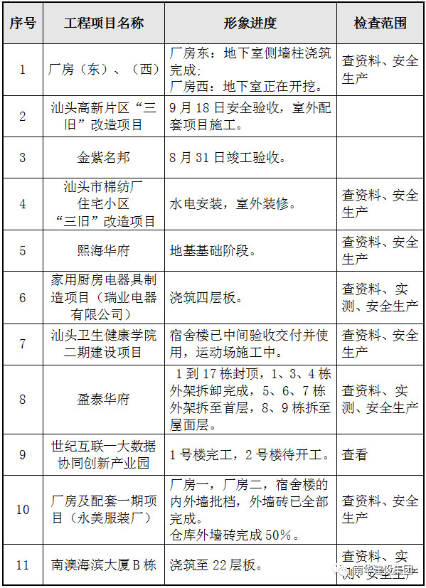 根据现阶段工程项目形象进度,本次季度检查对各阶段项目工程检查如下: