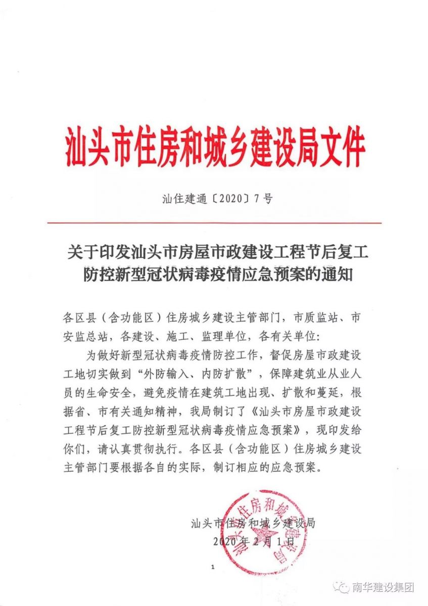 <<关于汕头市房屋市政建设工程节后复工有关事项的通知