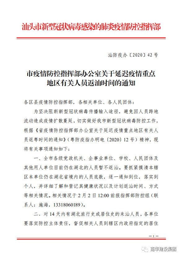 汕头市疫情防控指挥部办公室关于延迟疫情重点地区有关人员返汕时间的通知