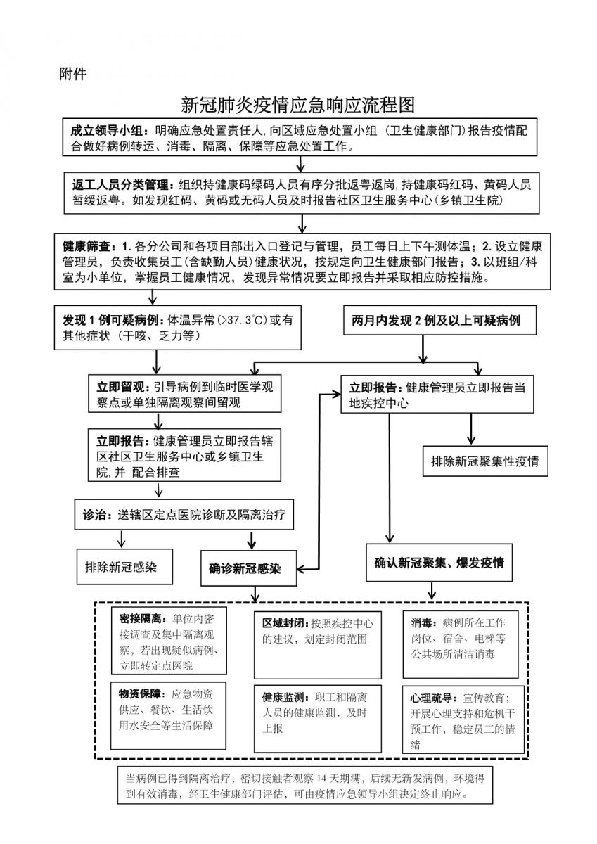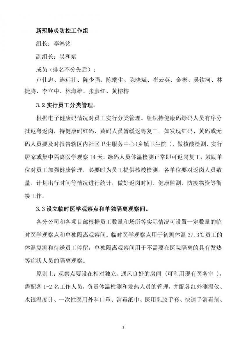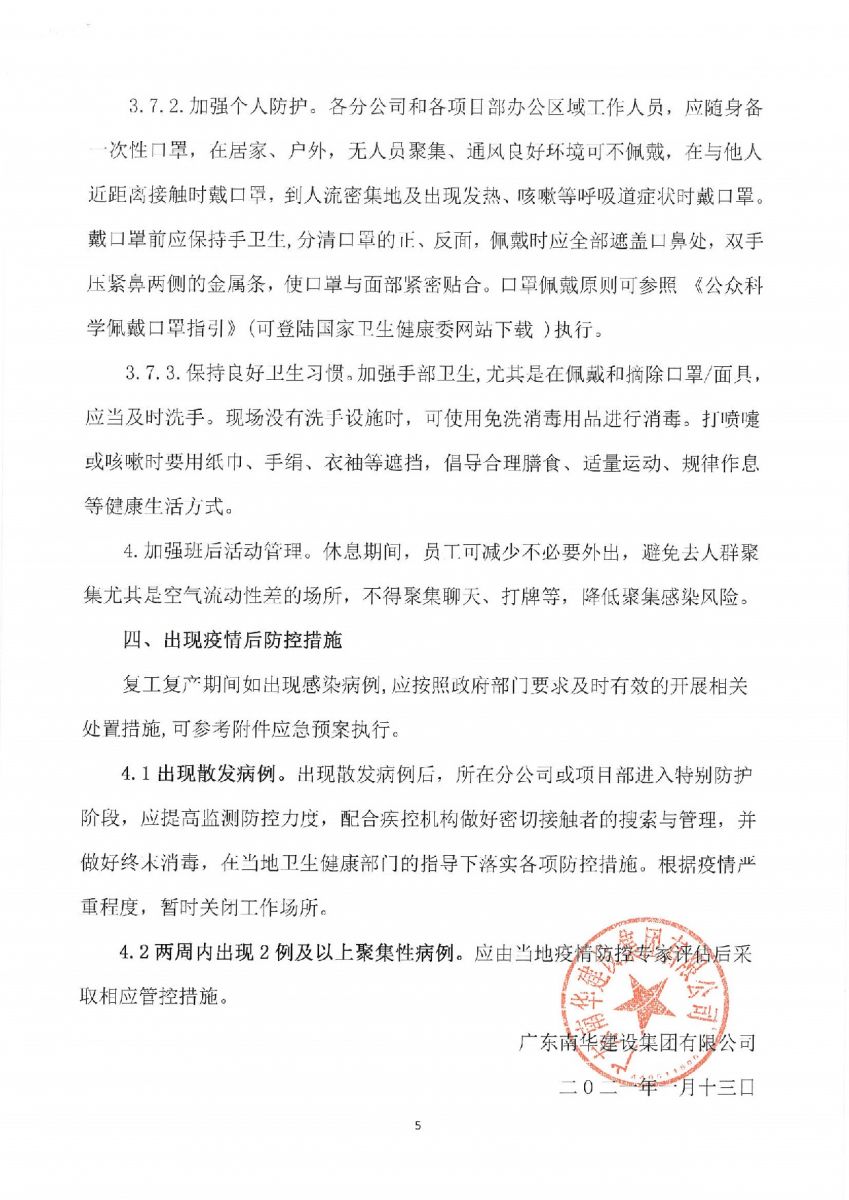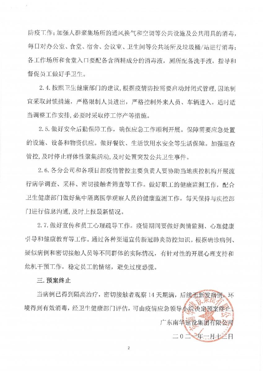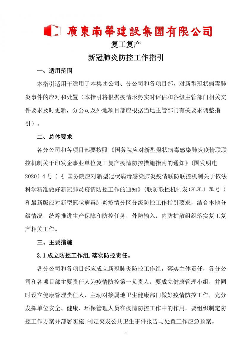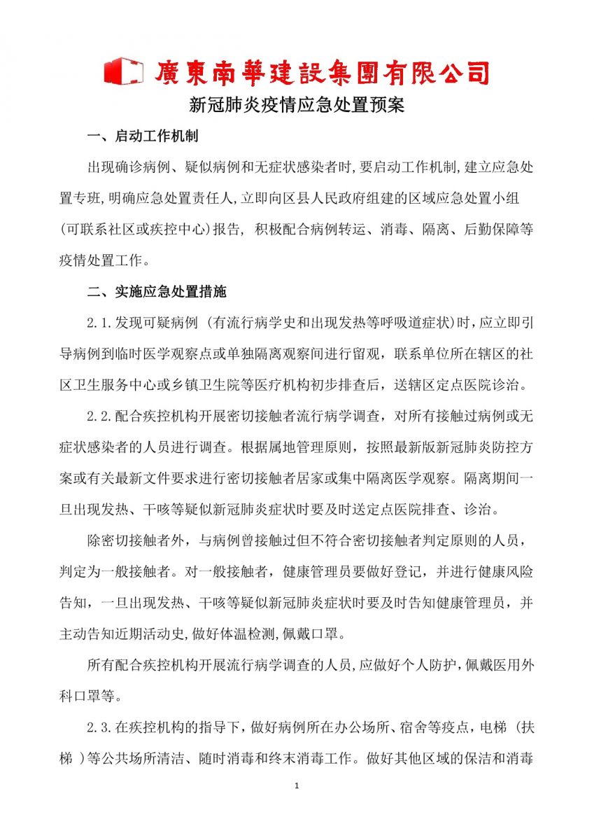 南华建设集团《复工复产新冠肺炎防控工作指引》《新冠肺炎疫情应急处置方案》
