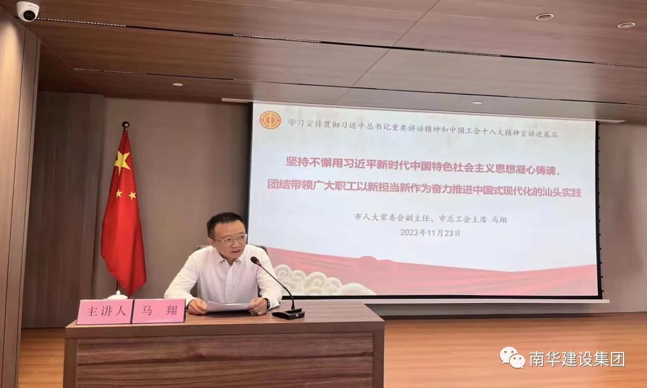 11月23日上午,由汕头市总工会主办、金平区总工会协办的学习贯彻习近平总书记重要讲话精神和中国工会十八大精神主题宣讲活动在广东南华建设集团有限公司举办,市人大常委会副主任、市总工会主席马翔出席活动并作专题宣讲,市、区总工会有关领导同志及我市的中国工会十八大代表、工会干部和职工代表参加学习。南华建设集团作为金平区产业工人队伍建设试点企业,在市、区总工会的指导下,公司密切结合企业实际,以党建带工建,工建促党建,凝聚广大职工力量,汇集广大职工智慧,把企业建设成一个“和谐发展、廉洁高效”的坚强团队。我们要认真学习宣传贯彻好习近平总书记重要讲话精神和中国工会十八大精神,充分发挥工人阶级主力军作用,大力弘扬劳模精神、劳动精神、工匠精神,以实际行动推动公司走好高质量发展之路。
