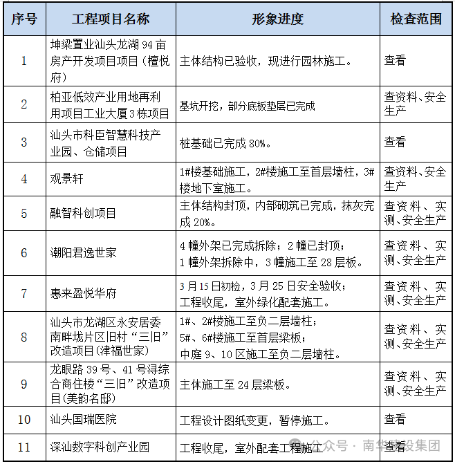 本季度正值于岁末年初及春节后复工复产重点时期,根据《汕头市住房和城乡建设局印发的关于开展岁末年初房屋市政工程安全隐患专项整治和督导检查方案的通知》和《广东省住房和城乡建设厅关于2024年春节后房屋市政工程复工复产安全防范工作的通知要求》,集团公司春节前对在建项目建筑起重机械、高支模、深基坑、脚手架、高处坠落、预防坍塌和施工消防安全等工程分别进行了专项检查,要求各在建项目及各分公司应落实全过程消防质量管理责任,加强施工现场消防安全标准化管理,深入开展专项消防安全排查整治。按要求设置消防设施和配备消防器材确保消防设施器材齐全有效。规范用火、用电、用气管理,严格执行动火审批制度,重点对宿舍、食堂、办公室等人员密集和火灾风险较高场所管控,排查清理不符合防火要求的活动板房。