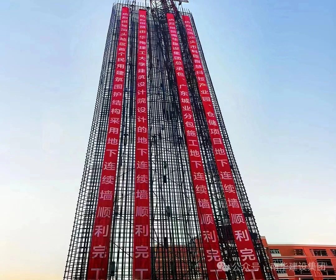 由集团公司承建的“科臣智慧科技产业园仓储项目”,围护结构采用钢筋混凝土地下连续墙+内支撑体系,实现“两墙合一”,相对于传统的先做支护再做地下室结构外墙的做法,可缩短工期,降低造价。该工程位于汕头市泰山南路东侧,总建筑面积104046.20m²,基坑开挖深度约9.2m,连续墙墙身平均长度38米,墙身底部伸入软土层(地下土体结构第6层)2米,连续墙切断第4层(砂土层)中的承压水,防止基坑开挖过程中出现坑底突涌,由于软土层渗透系数小可以充当不透水层,连续墙和软土层形成近似封闭的立体隔水空间,提高了建筑物永久地下室的防水性能,并保证了基坑工程开完过程的周边环境水土平衡和稳定性。连续墙在汕头地区的应用案例较少,同样的地质条件可以借鉴的工程项目相对稀缺,因此需不断在实践中摸索与改进相关施工工艺。