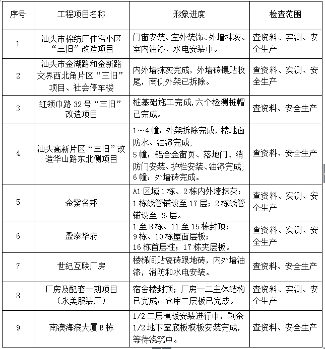下面9个项目工程接受本次检查。
