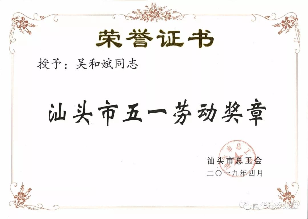 劳动创造价值,劳动创造美好,在“五一国际劳动节”这个属于我们劳动者的欢乐节日到来之际,吴和斌同志作为集团公司劳动者的代表,被授予“汕头市五一劳动奖章”。