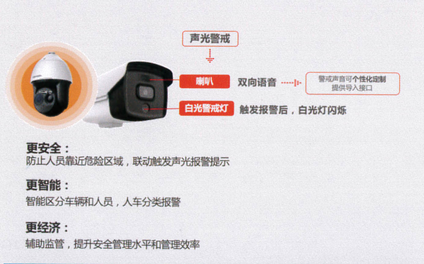 通过在施工现场危险区域安装智能AI摄像头,对不规范安全行为进行全天监控,对临边、危险性较大部位安装区域报警摄像头,可以通过网络传输监控影像,还主动发出语音警报和高光灯提示人员不得进入危险区域。