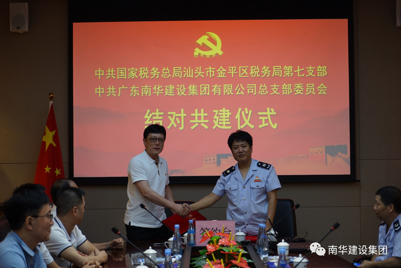 为深入贯彻落实全面从严治党新要求,进一步探索基层党建工作创新思路,通过基层党组织结对共建活动,着力构建基层党建工作新格局,6月19日,广东南华建设集团党总支和汕头市金平区税务局第七党支部组织召开了党日活动,重温了入党誓词,并举行党组织结对共建,通过结对共建,规范组织生活,提升组织活力,拓展党建阵地,打造党建品牌的“4项共建”。做到“8个共同”,即共同组织政治学习,共同参加组织生活会,共同开设主题党课,共同开展党日活动,共同成立一个先锋组织,共同推进“四个之家”,共同拓宽沟通渠道,共同创建“五个五”品牌。
