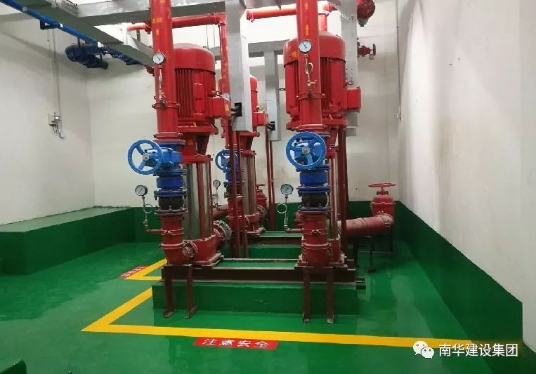 消防泵房:消防泵机房设备安装牢固、垂直,机房干净整洁;设备机房合理布置管线,阀门标高统一,方向统一,各类配件位置对应布置,排列整齐。
