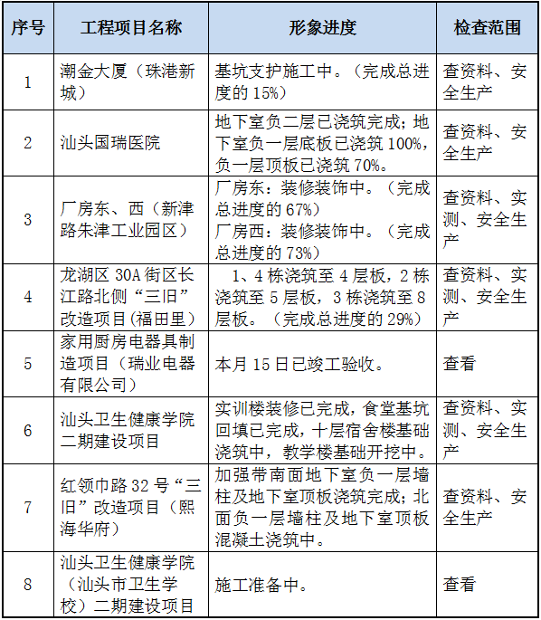 为强化建筑起重机械安全监管工作,保障建筑施工安全生产形势稳定,根据汕头市住建局文件通知,针对在建工程建筑起重机械安全专项检查,我集团公司予以积极配合,对各在建工程项目建筑起重机械进行自查自纠,塔吊、施工电梯等起重机械设备的实体检查、日常保养记录、运行记录、交接班记录、操作人员持证上岗、安全交底及定期保养情况均能按规定要求落实实施,确保使用安全。