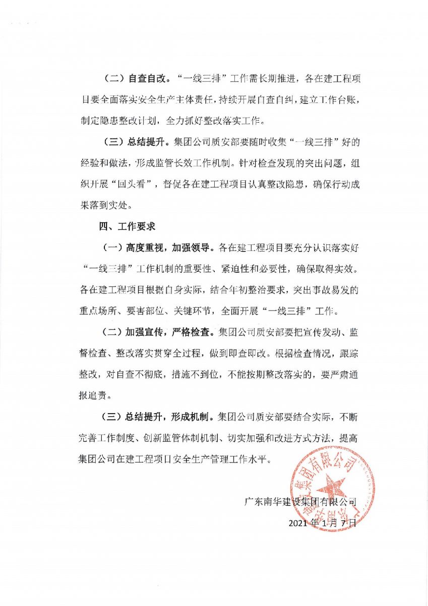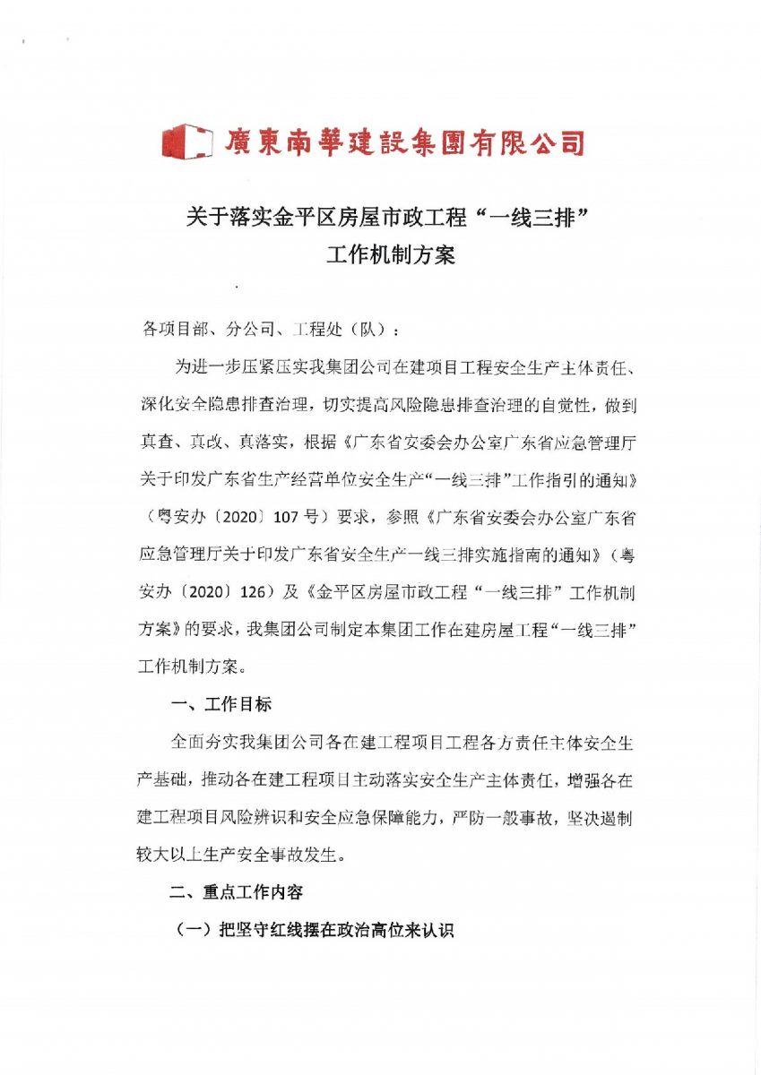 广东南华建设集团有限公司关于落实金平区房屋市政工程“一线三排”工作机制方案