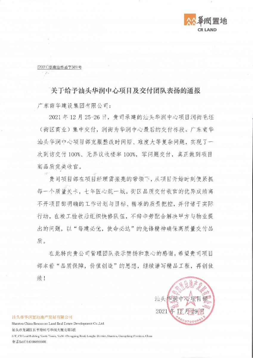 集团公司承建的汕头华润中心项目润街毛坯(街区商业)交付标段克服整改时间短、难度大等复杂问题,圆满完成标段任务,实现了一次到访交付100%、无异议收楼率100%,零问题交付,做到项目高品质完美收官而受到汕头华润置地的表扬通报。