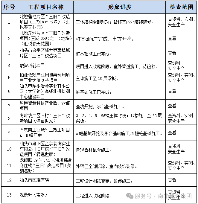 根据《汕头市住房和城乡建设局转发关于加强有限空间作业安全防范工作的通知》和《汕头市住房和城乡建设局关于开展全市房屋市政工程安全生产专项检查的通知》的要求,集团公司本季度重点对在建项目建筑起重机械、高支模、深基坑、高处坠落、预防坍塌、施工消防安全及有限空间作业等工程分别进行了专项检查,重点检查以下专项工程的落实情况如下:
