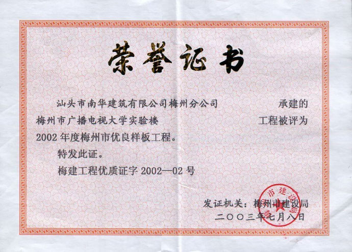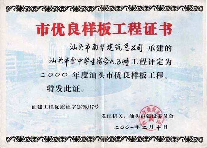 汕头市华新小学教学楼市样板证书